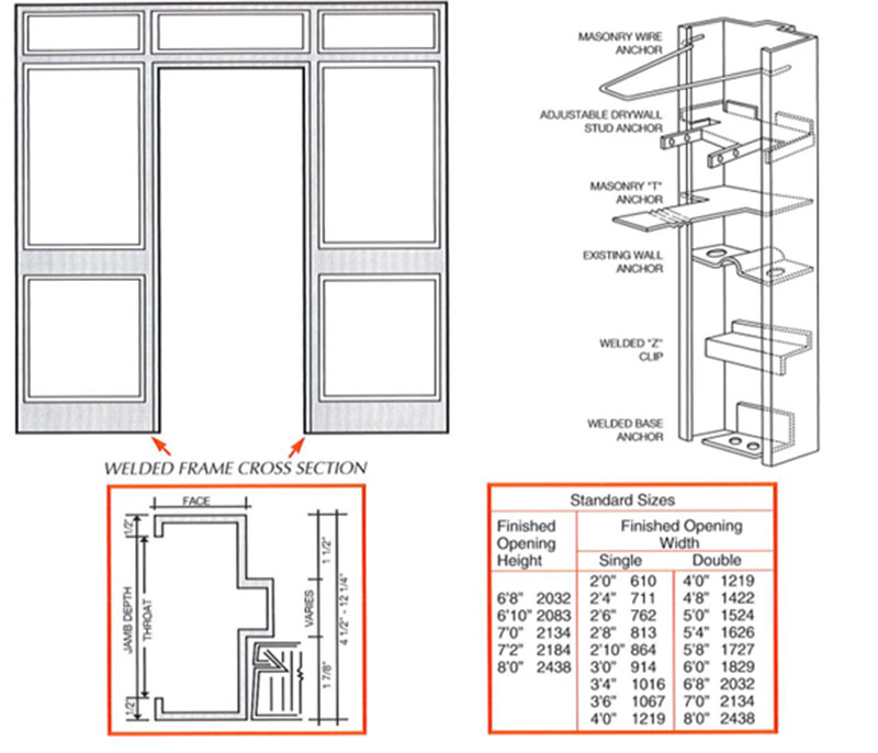 Interlink Doors & Windows carries a variety of standard 16- and 18-gauge metal frames. Most common stock welded frames sold are 3’0 x 7’0 and 3’2 x 7’0 and 6’0 x 7’0, with a 5-7/8” jamb size. These welded frames are available with a standard strike prep, standard strike prep and dead lock prep above, or blank with a panic bar reinforcement in the soffit.